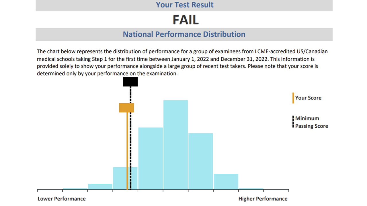 The first thing you should do once you feel ready to consider your next move after a Step 1 Fail is to figure out how close you were to passing. While the USMLE no longer gives you a 3-digit score, they do offer bar graphs that can be a helpful tool for figuring out how close you were. Below is an example score report from someone who recently took the exam.
