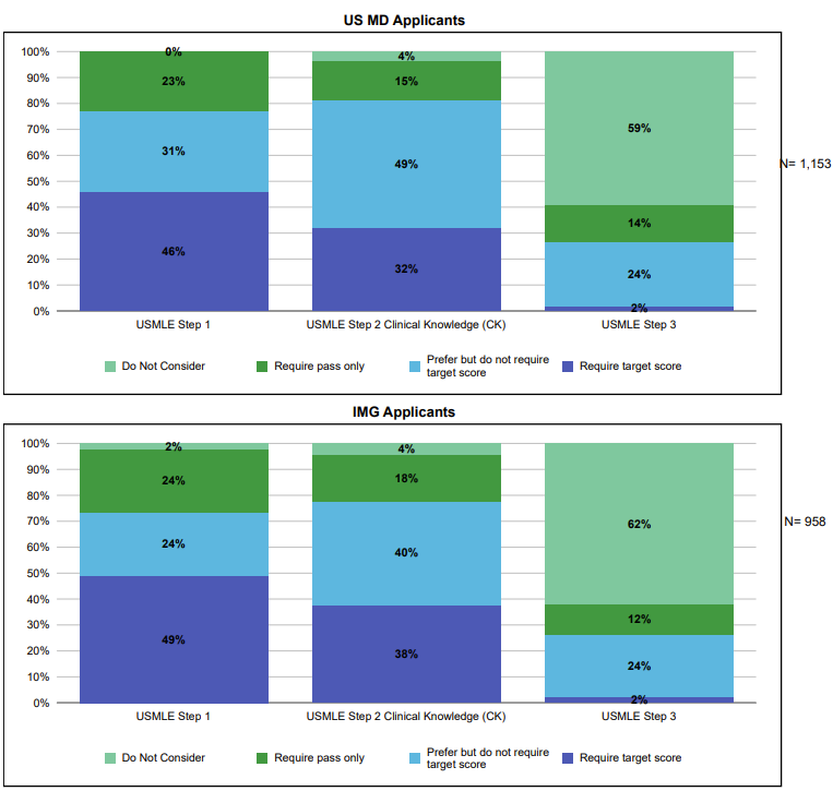 The chart below was taken from a survey of residency program directors in 2022 and shows the use of USMLE exams in the application process. For graduates of US MD programs, 23% of programs require a passing score which means they likely wouldn’t consider an individual who had failed Step 1. This number is very similar for IMG’s and DO’s.