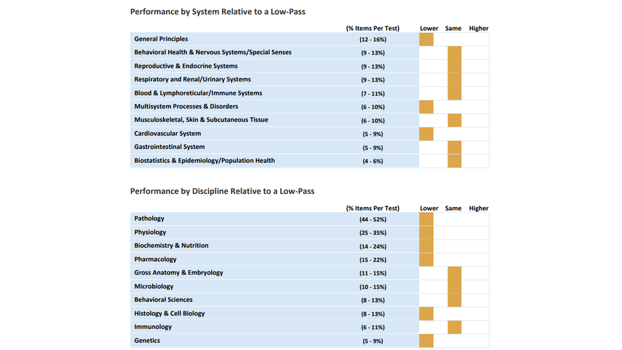 This report shows your strengths relative to a low pass. Any areas where you score Lower than the Low Pass need to be your priorities. In this particular example, this student should focus on General Principles, Multisystem Processes & Disorders, Cardiovascular, Pathology, Physiology, Biochemistry & Nutrition, Pharmacology, Histology & Cell Biology and Genetics. While some of these areas such as General Principles, Multisystem Processes & Disorders, Pathology and Physiology are somewhat vague, other areas such as Cardiovascular, Biochemistry & Nutrition, Histology & Cell Biology and Genetics are more concrete and easier to focus your time on. You can also use recent NBME’s taken before your Step 1 exam to see if certain subject areas are showing up on both exams.